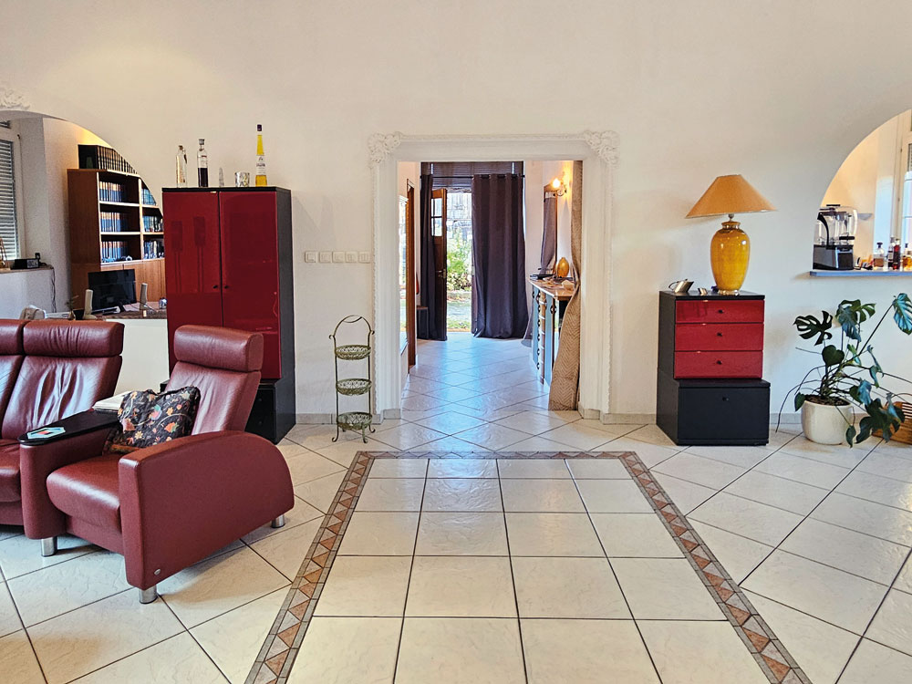 Das Haus verfügt über insgesamt 7 Zimmer. Im Erdgeschoß und im Obergeschoß befinden sich jeweils ein Bad und ein Gäste-WC. Im Erdgeschoß befindet sich das große Wohnzimmer mit Foyer zum Eingang, ein Arbeitszimmer auf der linken und die offene Küche auf der rechten Seite. Im hinteren Teil ist ein Gästezimmer mit eigenem Bad, ein Heizraum und ein Lagerraum mit einer großen Tür zur Straße. Es hat hochwertig geflieste Böden mit Fußbodenheizung und eine Einbauküche im Landhausstil. Eine zentrale Staubsaugeranlage sowie vier KFZ Stellplätze sind vorhanden. Das Objekt ist rundum in einem sehr gepflegten und umfangreich sanierten Zustand.